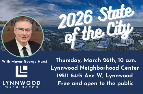 You're invited to our State of the City event featuring Mayor George Hurst on Thursday, March 26th, at 10 a.m. (doors will open at 9 a.m.) at the Lynnwood Neighborhood Center. Representatives from the City of Lynnwood departments will also have resource tables with information about upcoming events and available services. Join us as we come together to look ahead to the upcoming year!